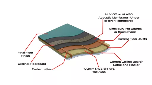 19mm Planc or dBX Boards: Depending on the specific requirements and materials available, either 19mm planks or 15mm dBX Boards are cut to size and fitted between the joists. These boards serve as an additional barrier against sound transmission.